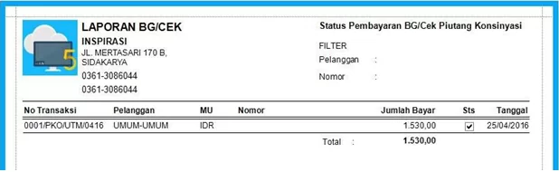 5. Akan tampil status pembayaran bg / cek piutang. Data akan tampil apabila saat pembayaran piutang memilih cara bayar cek/bg, dan status lunas tidak diberi tanda centang.