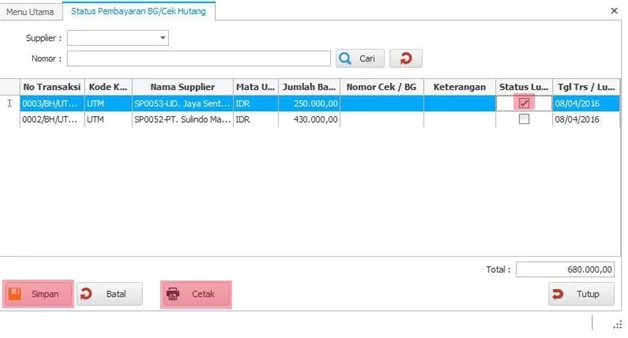 Status Lunas Cek/BG berfungsi untuk mengubah status pelunasan pembayaran menggunakan Cek/BG yang telah dicairkan.