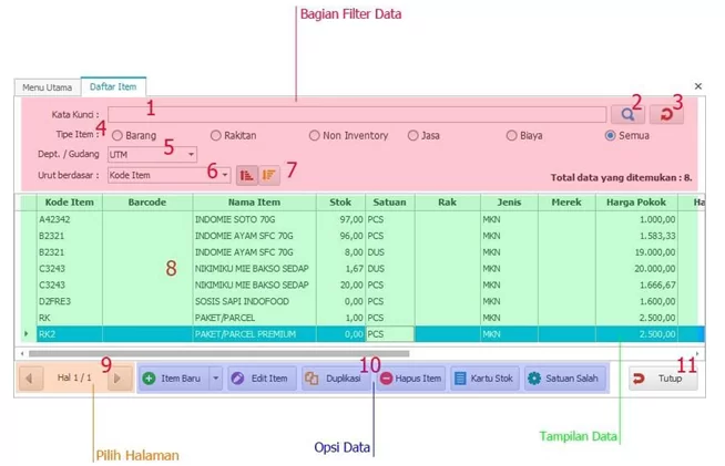 Berikut Informasi dan keterangan untuk tampilan Master Data Daftar Item.